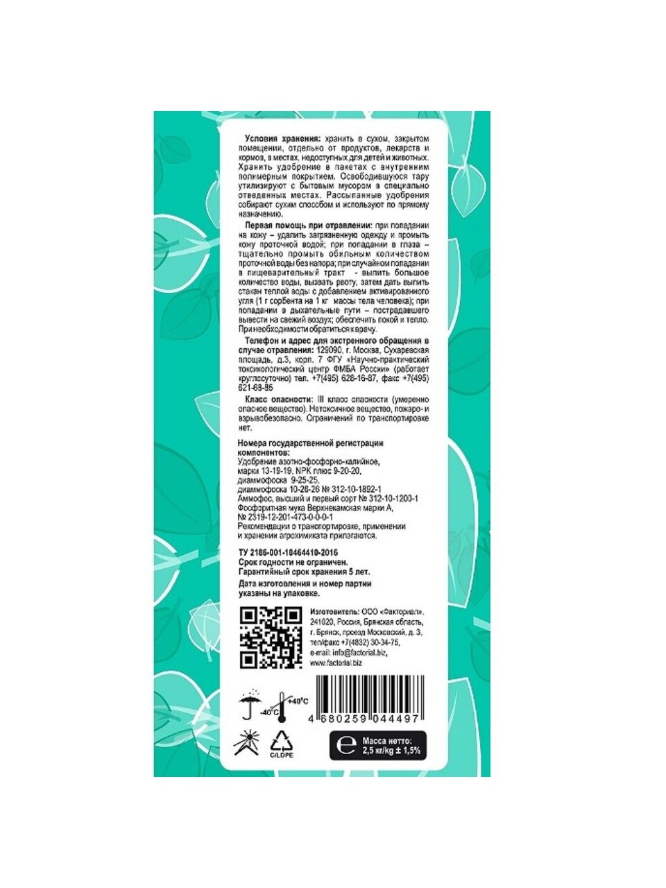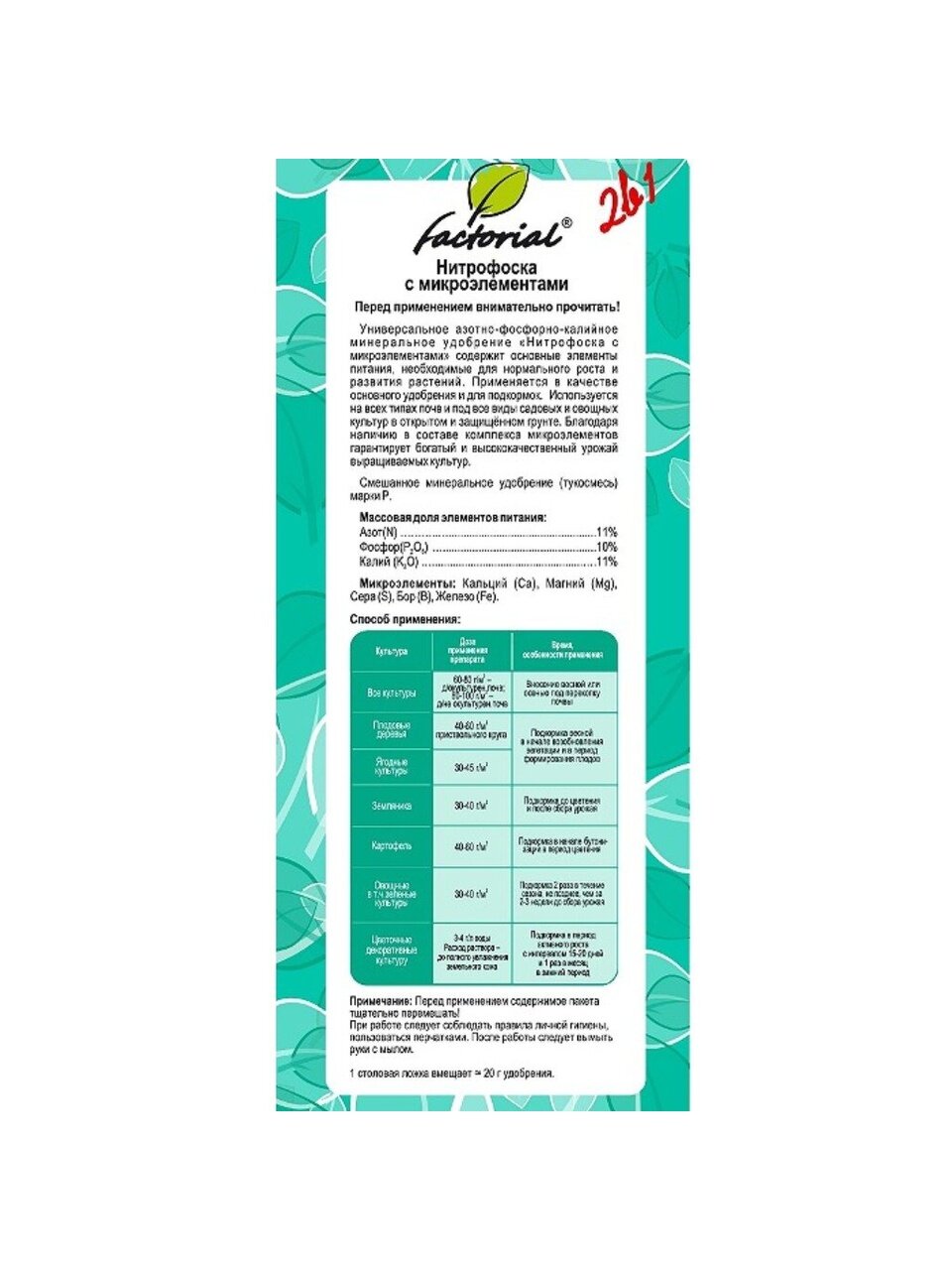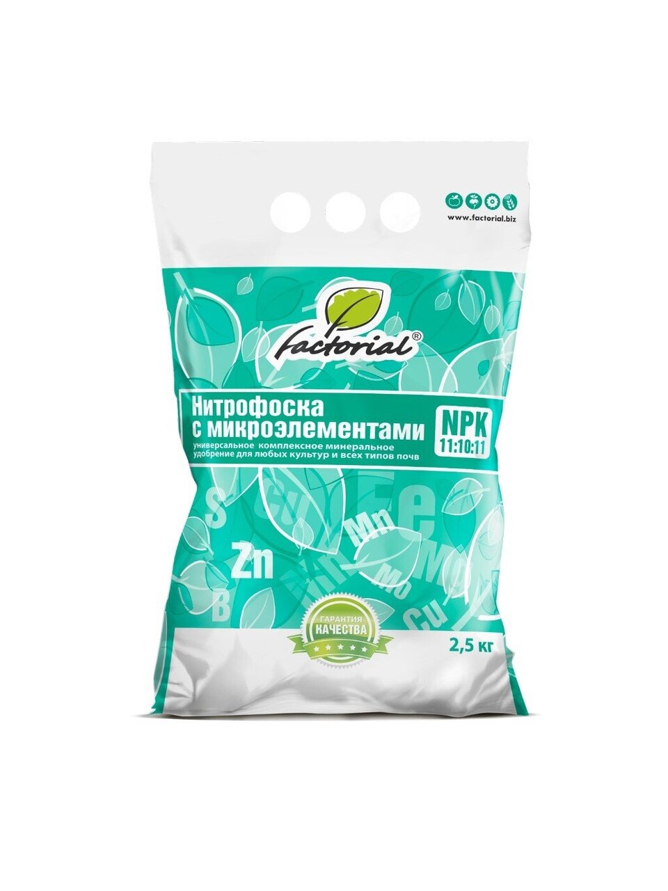 Удобрение Нитрофоска с микроэлементами от Factorial — универсальное минеральное средство в форме гранул для комплексного питания растений круглый год. Идеально подходит для всех типов культур, способствует активному росту, развитию и повышению урожайности. Вес упаковки 2,5 кг позволяет эффективно использовать добавку на больших и малых участках, обеспечивая растения необходимыми элементами.