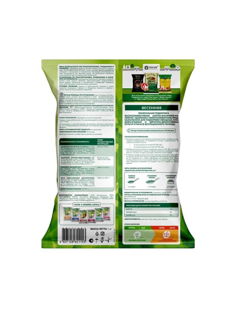 Удобрение Сотка Тукосмесь — идеальное решение для весеннего ухода за растениями. Универсальная минеральная добавка в гранулах способствует активному росту и укреплению культур, обеспечивая оптимальный баланс питательных веществ. Пакет весом 1 кг удобен для хранения и использования.