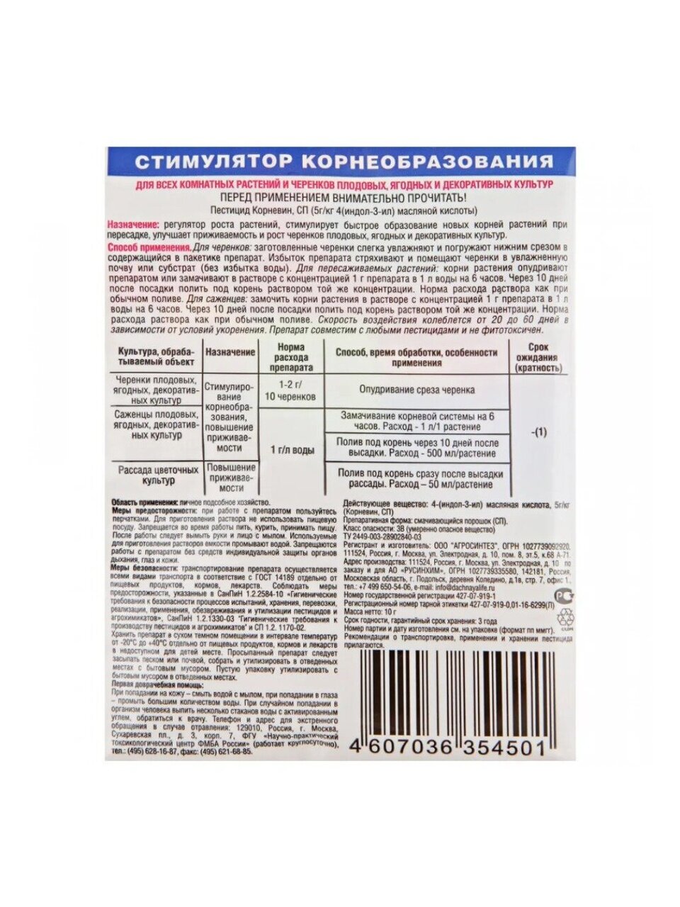 Состав: 4 (индол-3-ил) масляная кислота, 5 г/кг (Пестицид Корневин, СП).