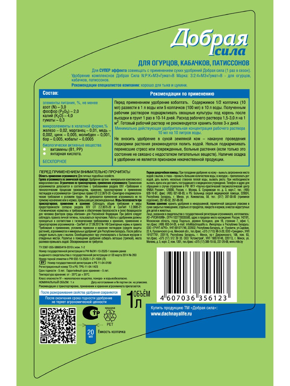 Удобрение для огурцов, кабачков и патиссонов «Добрая сила», жидкость 1 л — быстрый рост и высокий урожай даже на сложных почвах. Экономия времени и уверенность в результате.