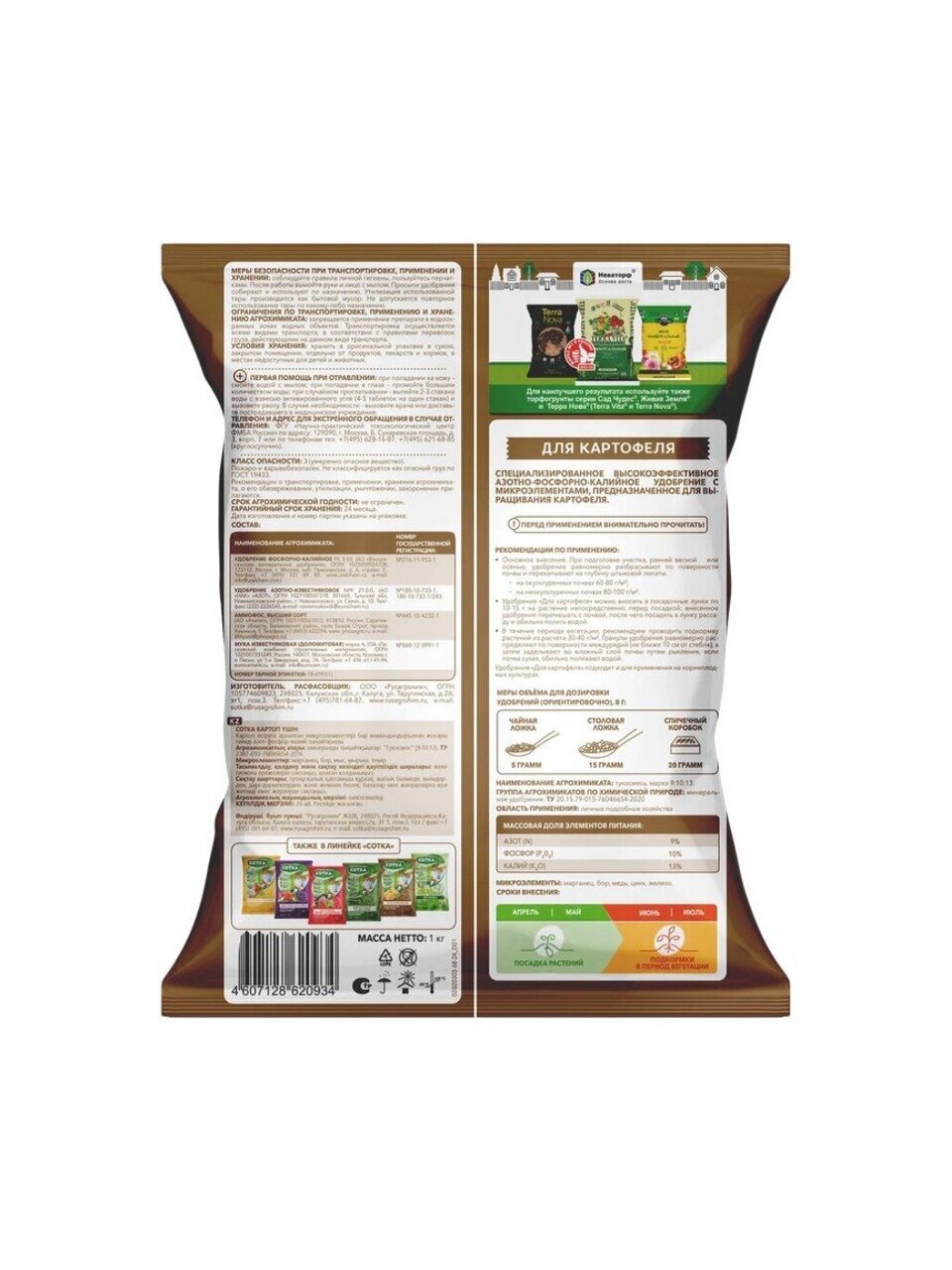 Удобрение Тукосмесь для картофеля, пакет 1 кг от бренда Сотка — эффективное минеральное средство для активного роста и развития картофеля. Идеально подходит для весеннего сезона и обеспечивает полноценное питание растениям. Сбалансированный состав способствует формированию крепких клубней и повышению урожайности. Выгода: получение здорового и богатого урожая картофеля без лишних хлопот.
