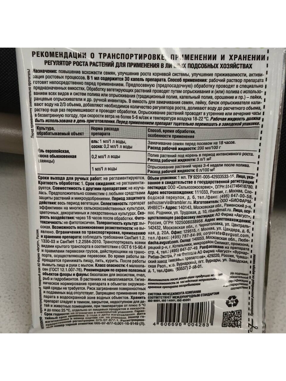 Улучшение приживаемости, усиление ростовых процессов, повышение всхожести семян - 1 мл/1 литр воды. Замачивание семян перед посевом на 18 часов. Расход рабочей жидкости – 200 мл/100 г - 0,2 мл/1 литр. Полив растений под корень в период интенсивного роста. Расход рабочей жидкости – 3 л/м2 - 1 мл/1 литр воды. Опрыскивание растений через 3-4 недели после полива. Расход рабочей жидкости – 6 л/100 м2