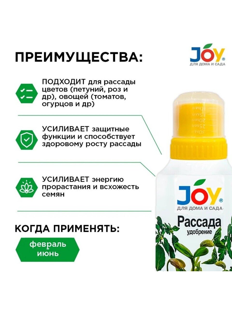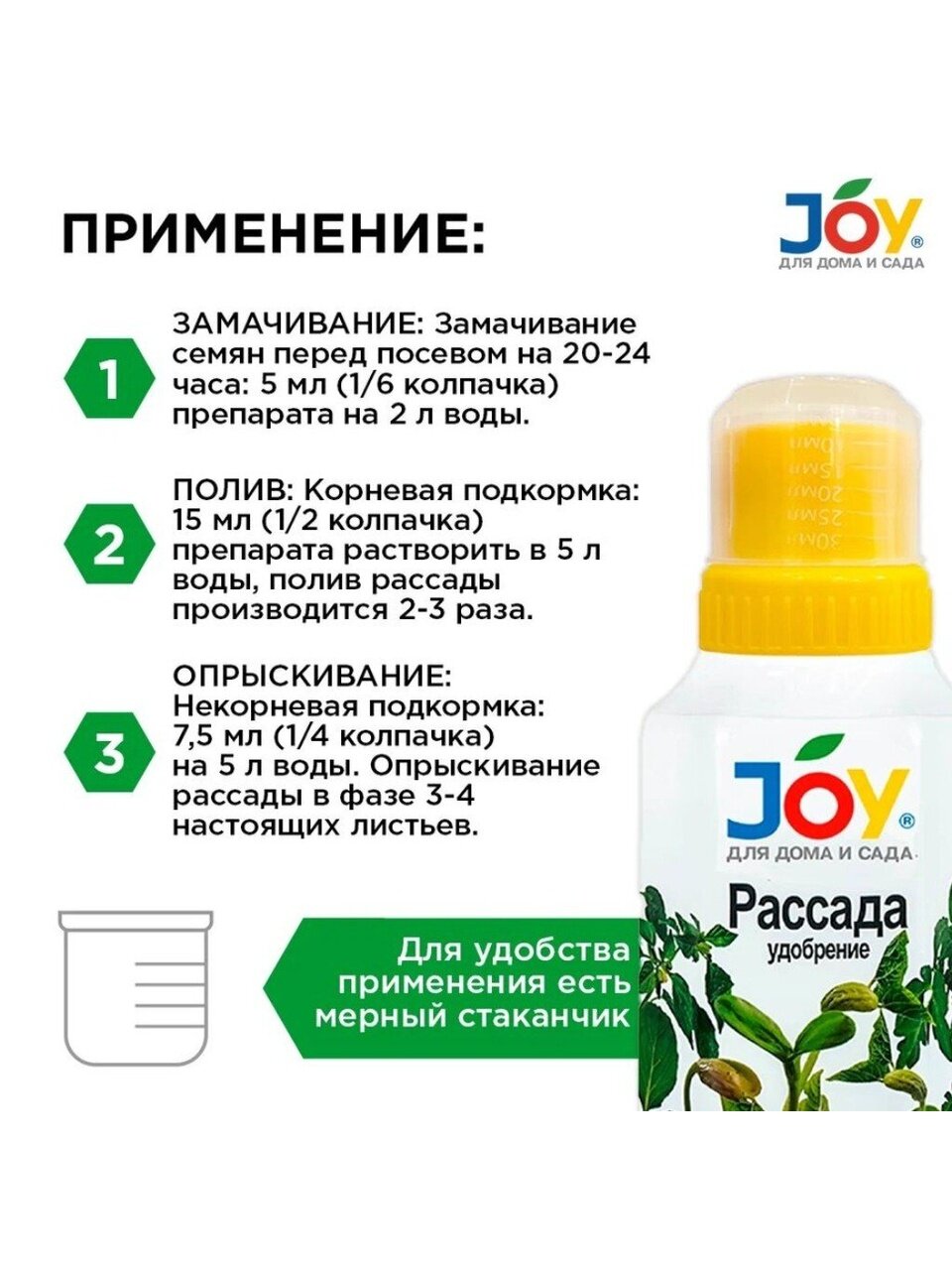 Удобрение для рассады JOY 330 мл 4607043130372 применяется для выращивания рассады овощных и цветочных культур.