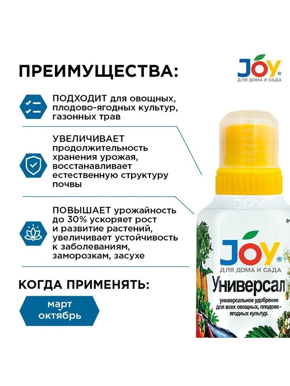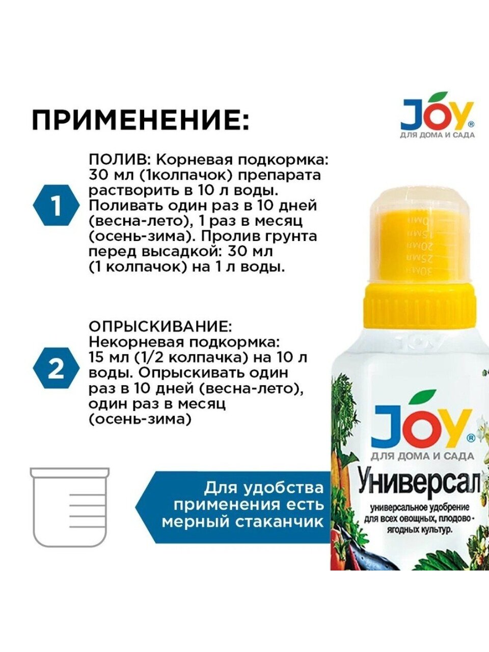 Жидкое удобрение JOY "Универсал" - специализированное удобрение с высоким содержанием гуминовых и фульвовых кислот. Содержит полный комплекс веществ, необходимый для полноценного питания в легкодоступной форме. Оно станет отличным помощником цветоводу и садоводу в выращивании различных культур как в квартире, так и в саду и огороде. Подходит для рассады.