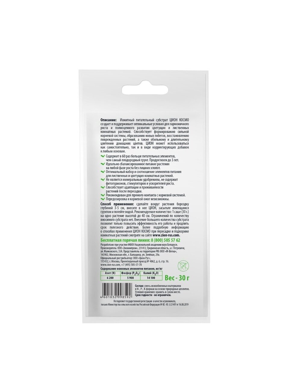 ЦИОН Космо содержит в качестве носителя небольшой процент органической полимерной матрицы, в отличие от остальных продуктов ЦИОН, где в качестве носителя элементов питания растений используются природные минералы (цеолиты). Органический полимерный носитель позволяет дозировать и доносить до корней растений азот в нитратной форме. Таким образом, декоративно лиственные комнатные растения гармонично развиваются в помещении, увеличивая размер и количество листьев и приобретая яркий, насыщенный цвет.