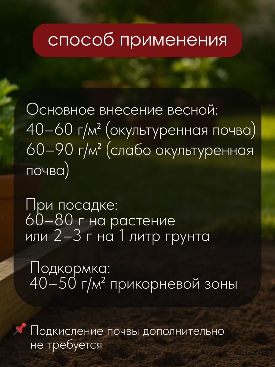 - Основное внесение при обработке почвы весной: 40-60 г/м2 - на окультуренных почвах и 60-90 г/м2 - на слабо окультуренных почвах.