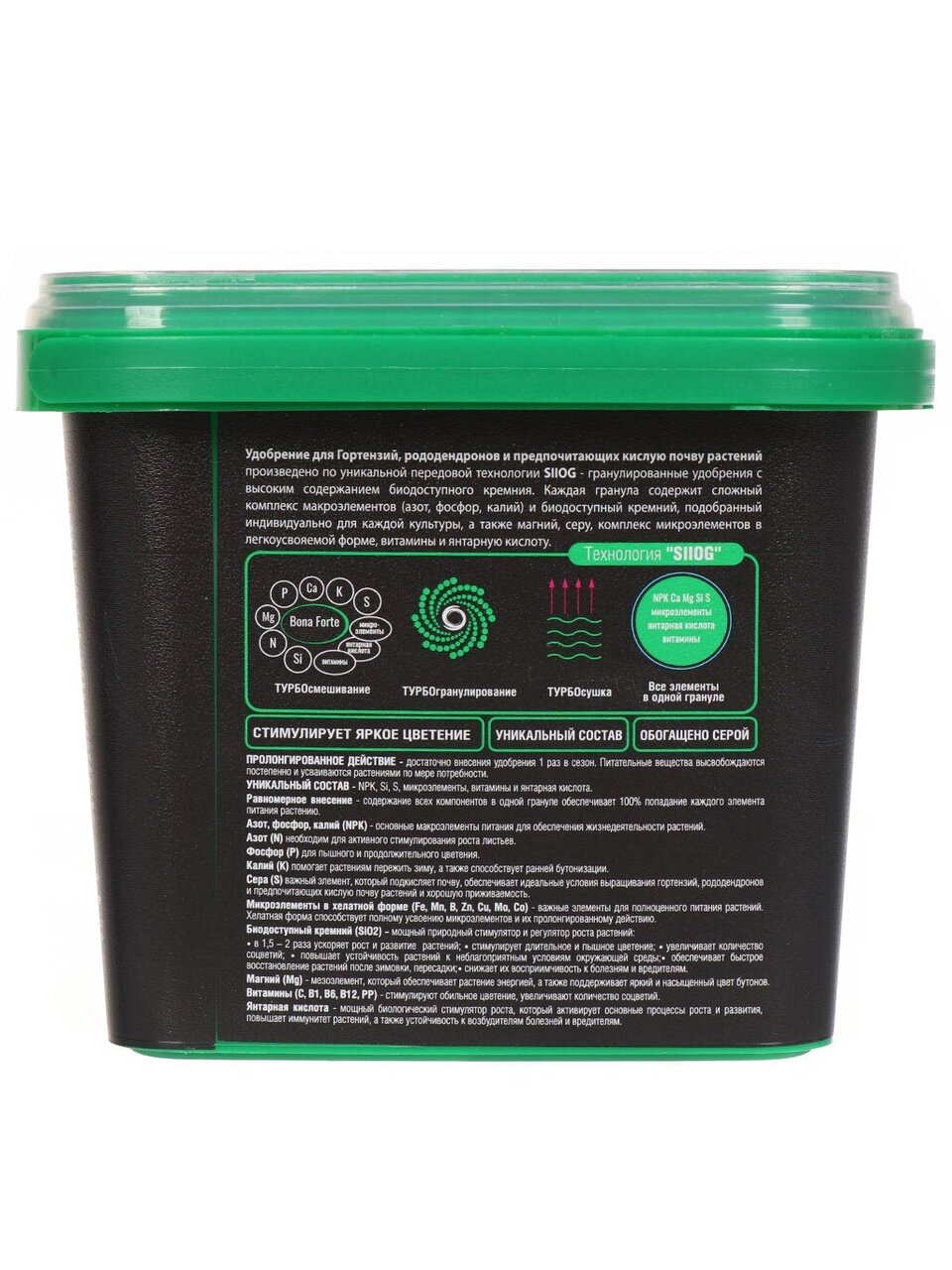Подходит для гортензий, рододендрон, голубики, хвойных и других растений, требующих кислую почву.