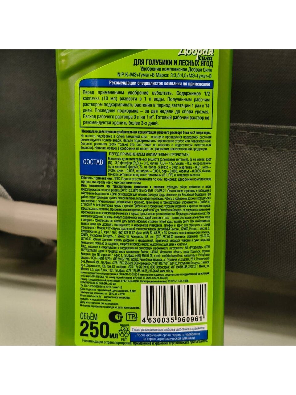 Удобрение органо-минеральное Добрая сила для голубики и лесных ягод содержит полный комплекс веществ, необходимых для полноценного и сбалансированного питания растений. Ускоряет сроки созревания. Увеличивает урожай. Стимулирует образование связей. Обеспечивает крупные и вкусные ягоды.