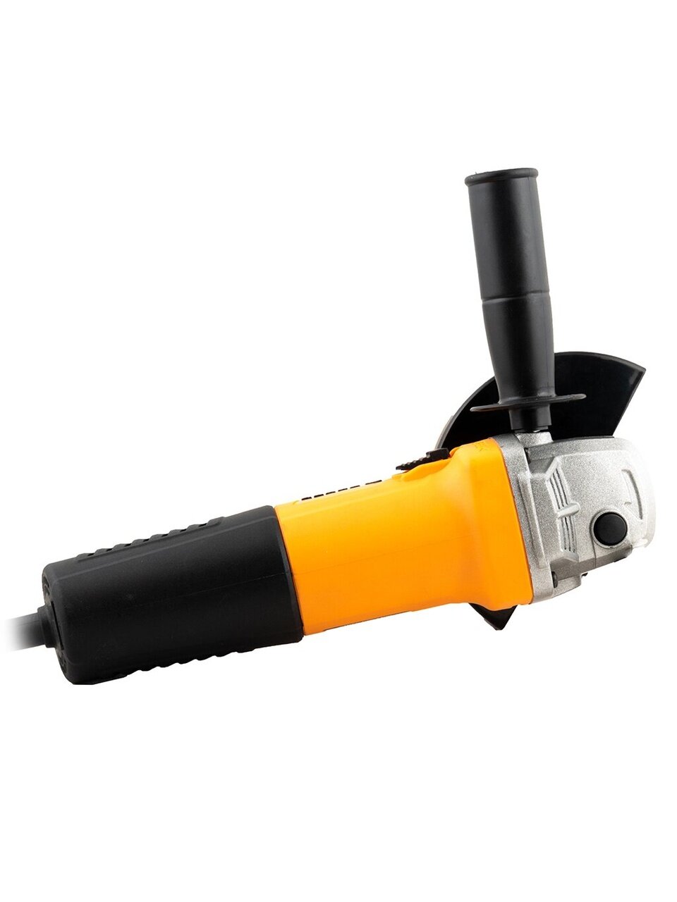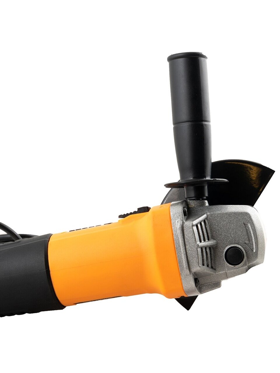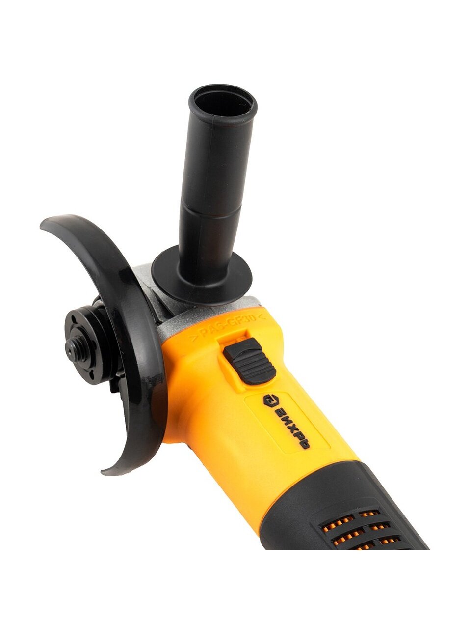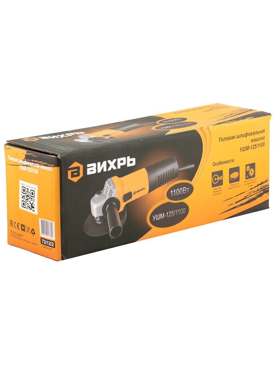 Углошлифовальная машина (болгарка) ВИХРЬ УШМ-125/1100 - инструмент, используемый для шлифования, зачистки поверхности или резки материала. Корпус редуктора выполнен из металла. Боковая рукоятка фиксируется в трех положениях для более удобной работы. Вытянутый корпус обеспечивает надежное удержание углошлифовальной машины во время работы. На корпусе инструмента предусмотрены вентиляционные отверстия, которые защищают рабочий механизм от перегрева. Отрезной диск закрыт кожухом для защиты оператора от травм. Предусмотрена кнопка блокировки шпинделя для быстрой и безопасной замены оснастки.