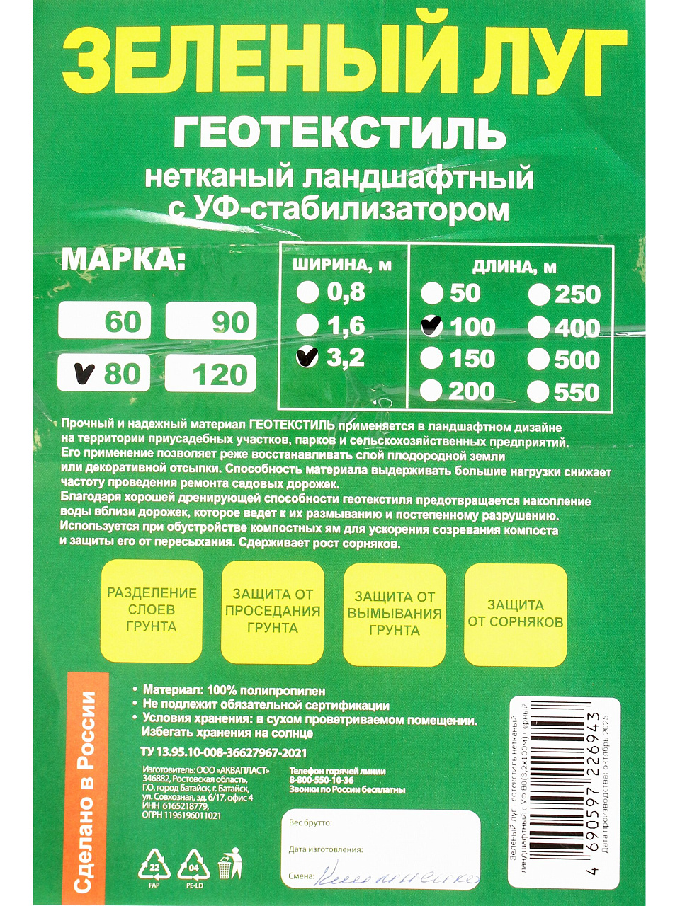 Вы можете приобрести «Материал укрывной 80 г/м2, Спанбонд, 3.2х100 м, Зеленый Луг, рулон, черный» и другие товары в нашем интернет-магазине в Орле по низким ценам и с бесплатным самовывозом.