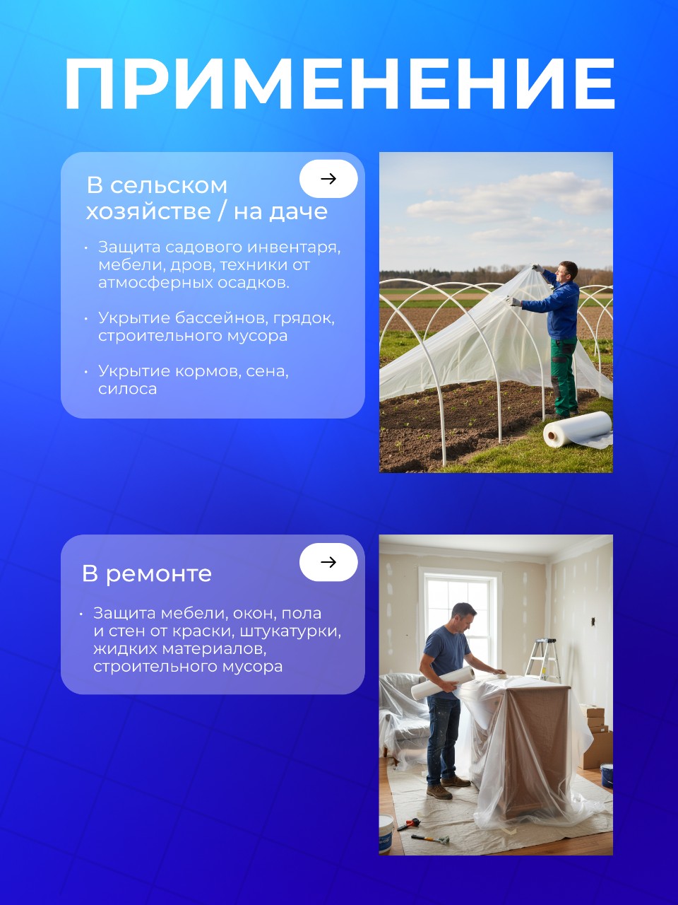 Пленка применяется во многих сферах народного хозяйства, особенно широко используется при изготовлении теплиц и парников. Вся пленка изготовлена по ГОСТу из первичного сырья и рассчитана на длительную эксплуатацию под солнцем и на ветру. Обычно парниковая пленка рассчитана на эксплуатацию в течение одного сезона. Но современные технологии производства позволили производить многолетнюю пленку, которая может служить до трех-четырех лет. Для этого в состав пленки вводятся УФ-светостабилизаторы.