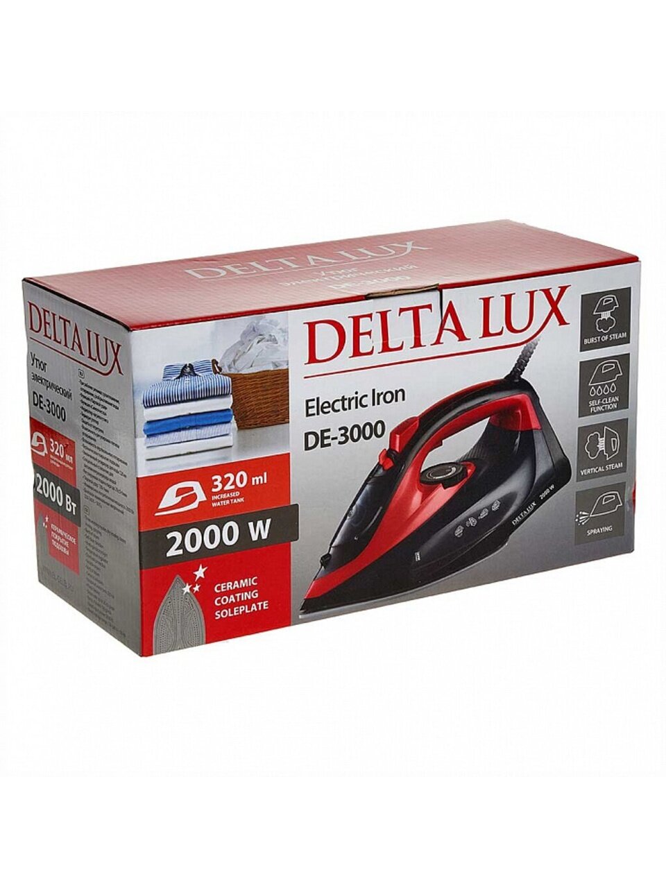 Вы можете приобрести «Утюг Delta, DE-3000, 2000 Вт, керамика, вертикальное отпаривание, 1.8 м, черный с красным» и другие товары в нашем интернет-магазине в Клинцах по низким ценам и с бесплатным самовывозом.