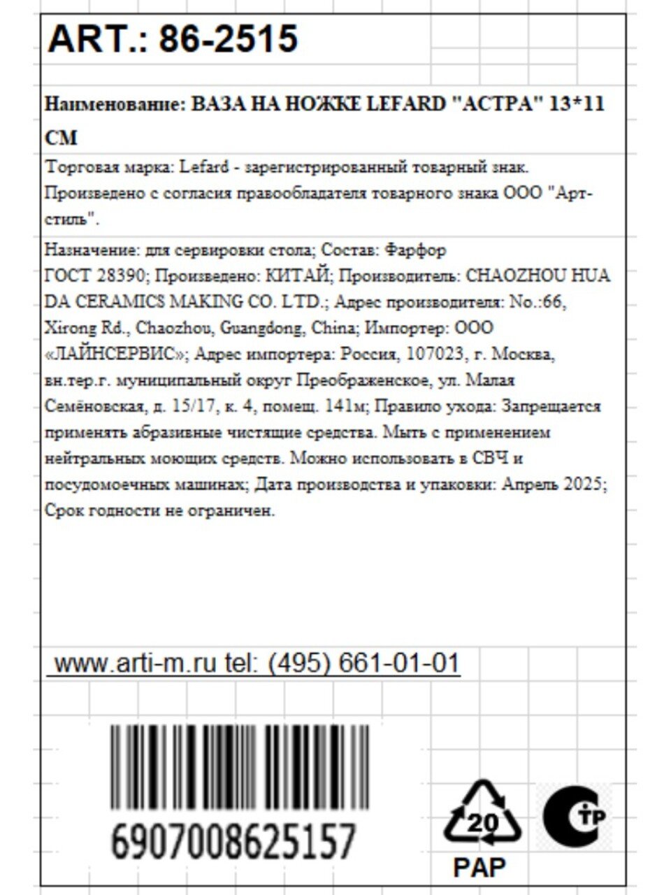 Да, фарфоровая ваза Lefard Астра подходит для использования в СВЧ и безопасна для мытья в посудомоечной машине — это подтверждено техническими характеристиками.