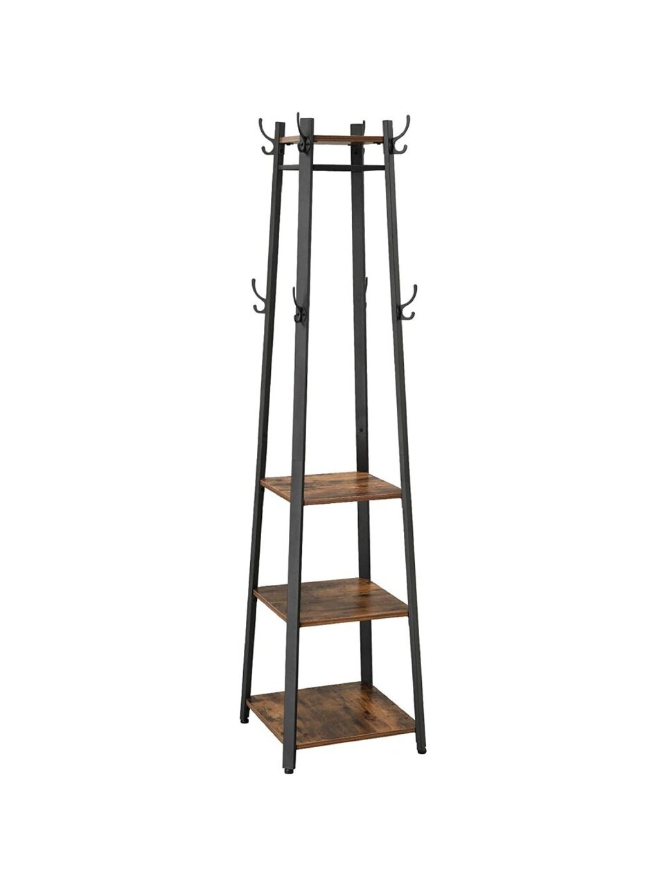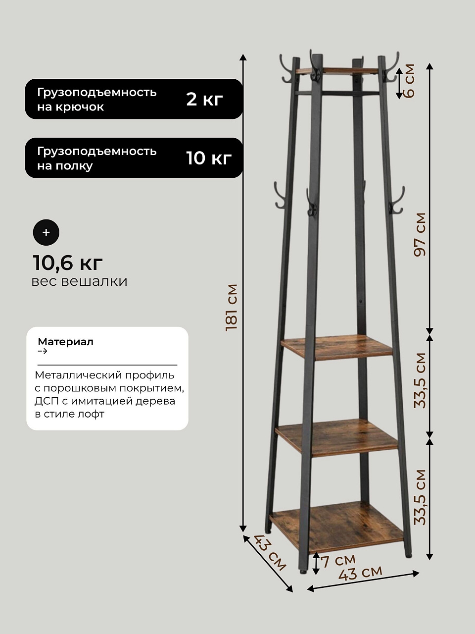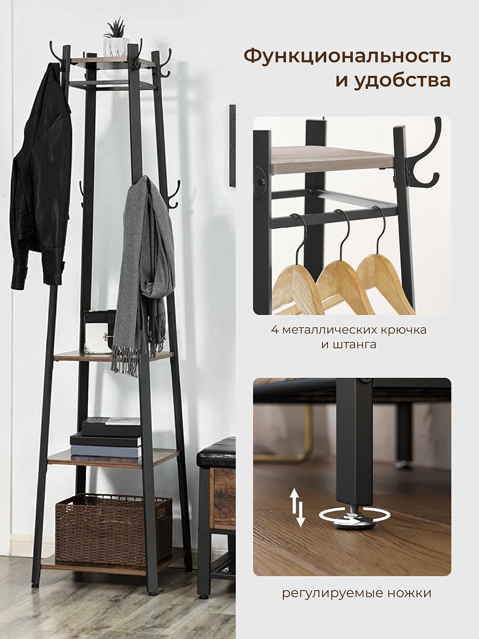 Ширина — 43 см, глубина — 43 см, высота — 181 см. Без колес, не телескопическая. Материал — сталь, цвет коричнево-черный, стиль — лофт. В комплекте 8 крючков для аксессуаров.