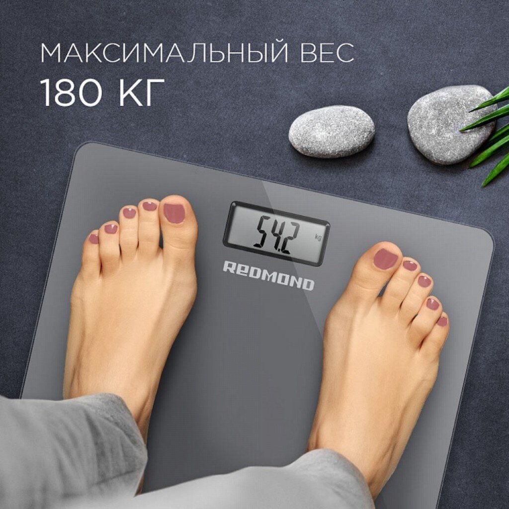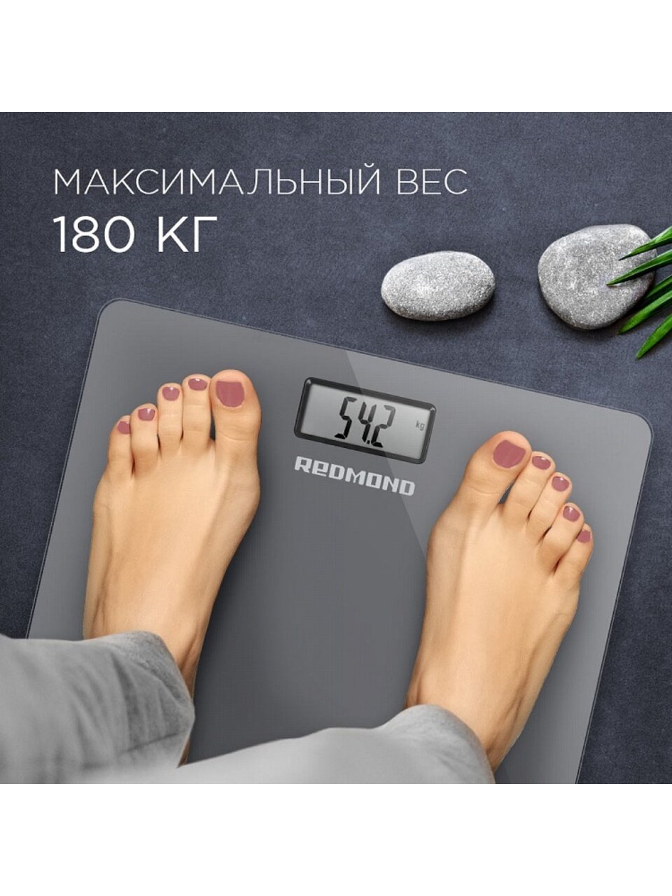 Электронные напольные весы Redmond RS-757: точность взвешивания до 180 кг, стильное стекло, компактный размер 28х28 см — для контроля веса дома и на даче.