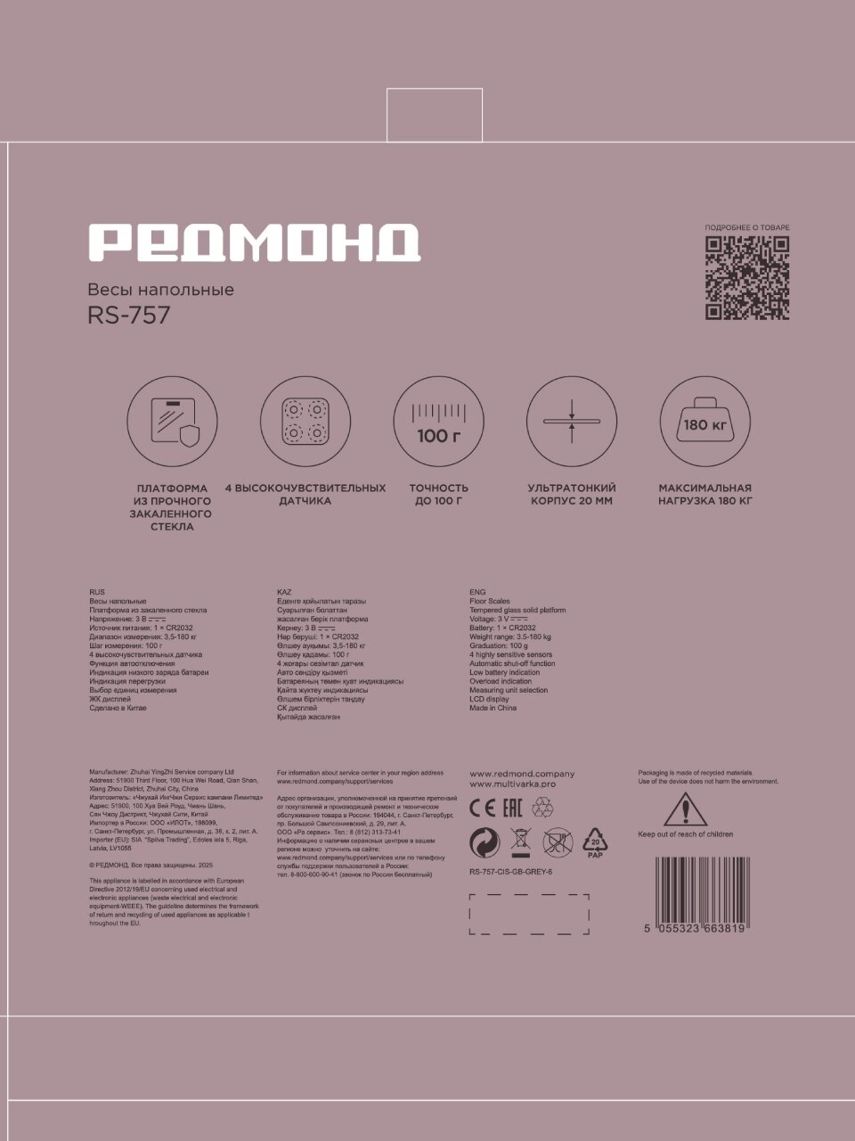 Покупая электронные весы Redmond RS-757, вы получаете точность, долговечность и стиль по выгодной цене. Оформите заказ сейчас — и начните контролировать свой вес с максимальным комфортом и уверенностью в результате.