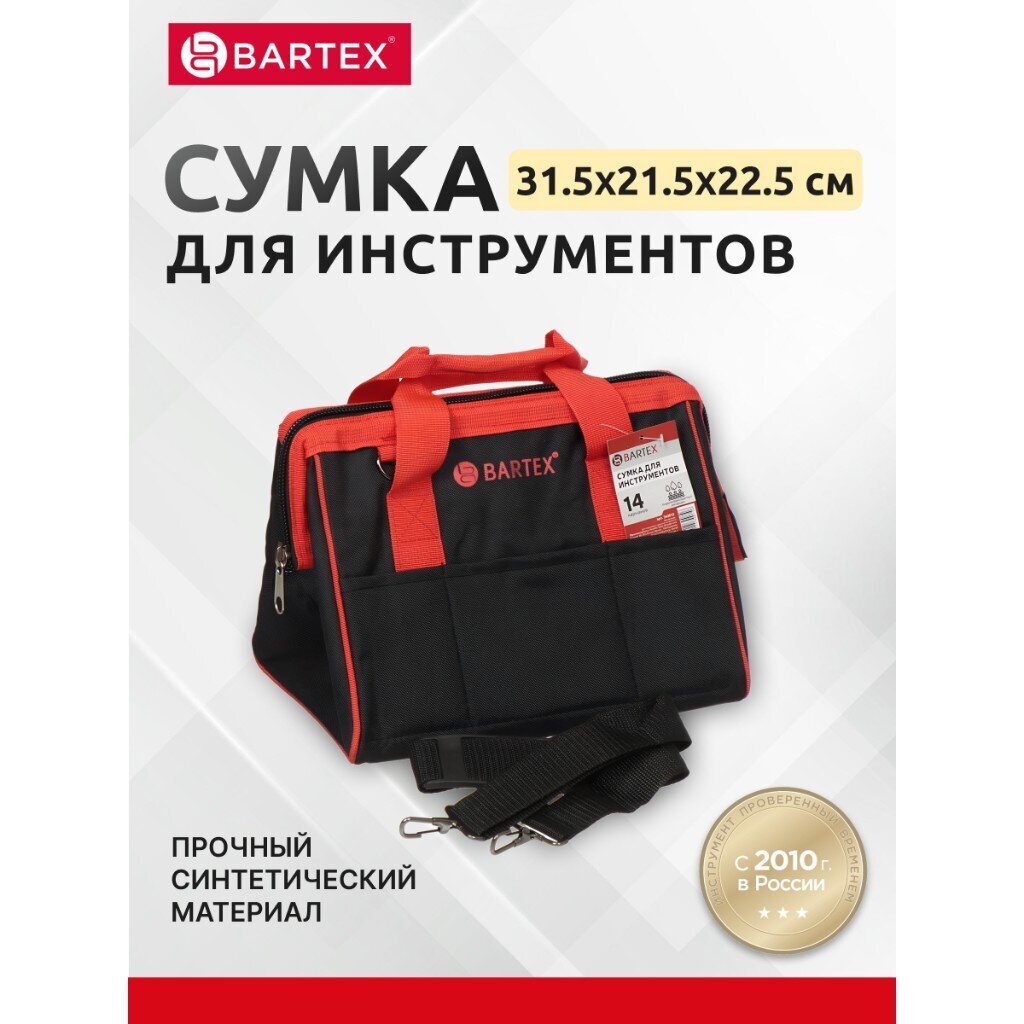 Сумка Bartex - идеальный помощник в тех случаях, когда ремонтные работы проводятся вдалеке от дома или привычного места хранения инструментов. Такой переносной аксессуар поможет Вам оптимизировать процесс ремонта и сократить время на поиски нужного инструмента.