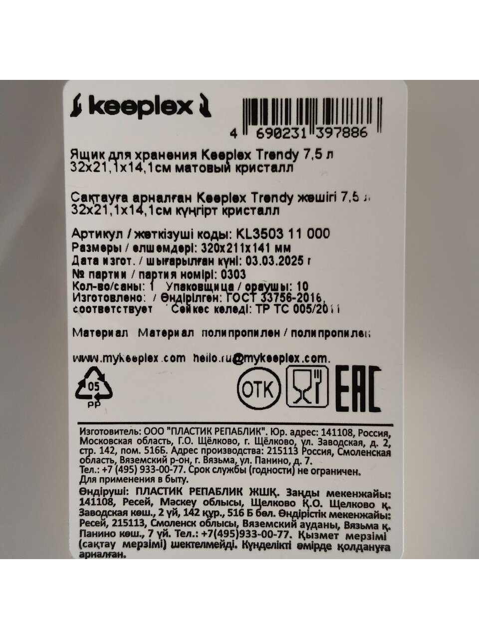 Вы можете приобрести «Ящик для хранения, 7.5 л, 32х21.1х14.1 см, с крышкой, матовый кристалл, Keeplex, Trendy, KL350311000» и другие товары в нашем интернет-магазине в Липецке по низким ценам и с бесплатным самовывозом.
