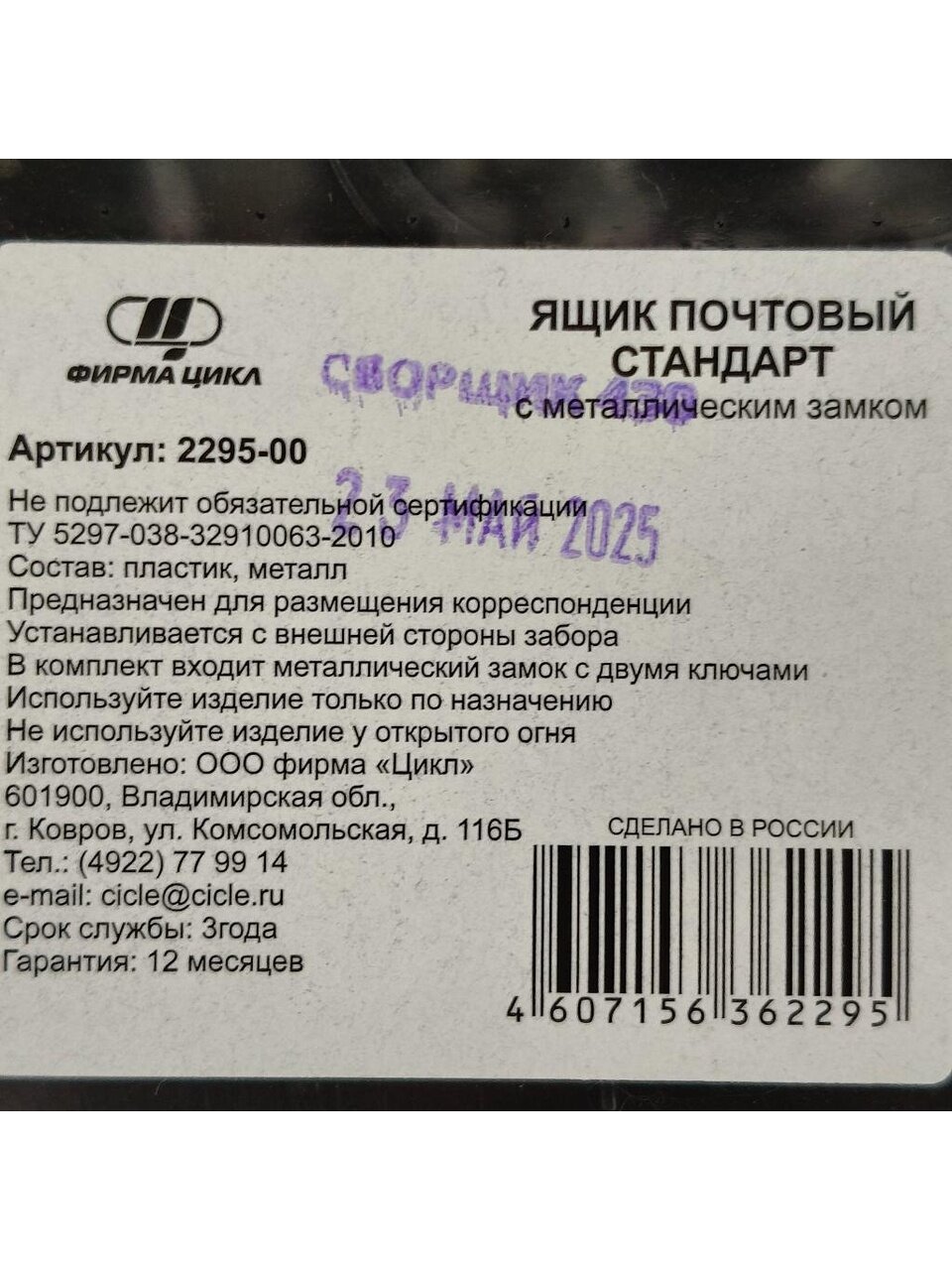 - Комплектация: ящик почтовый с металлическим замком и ключом.