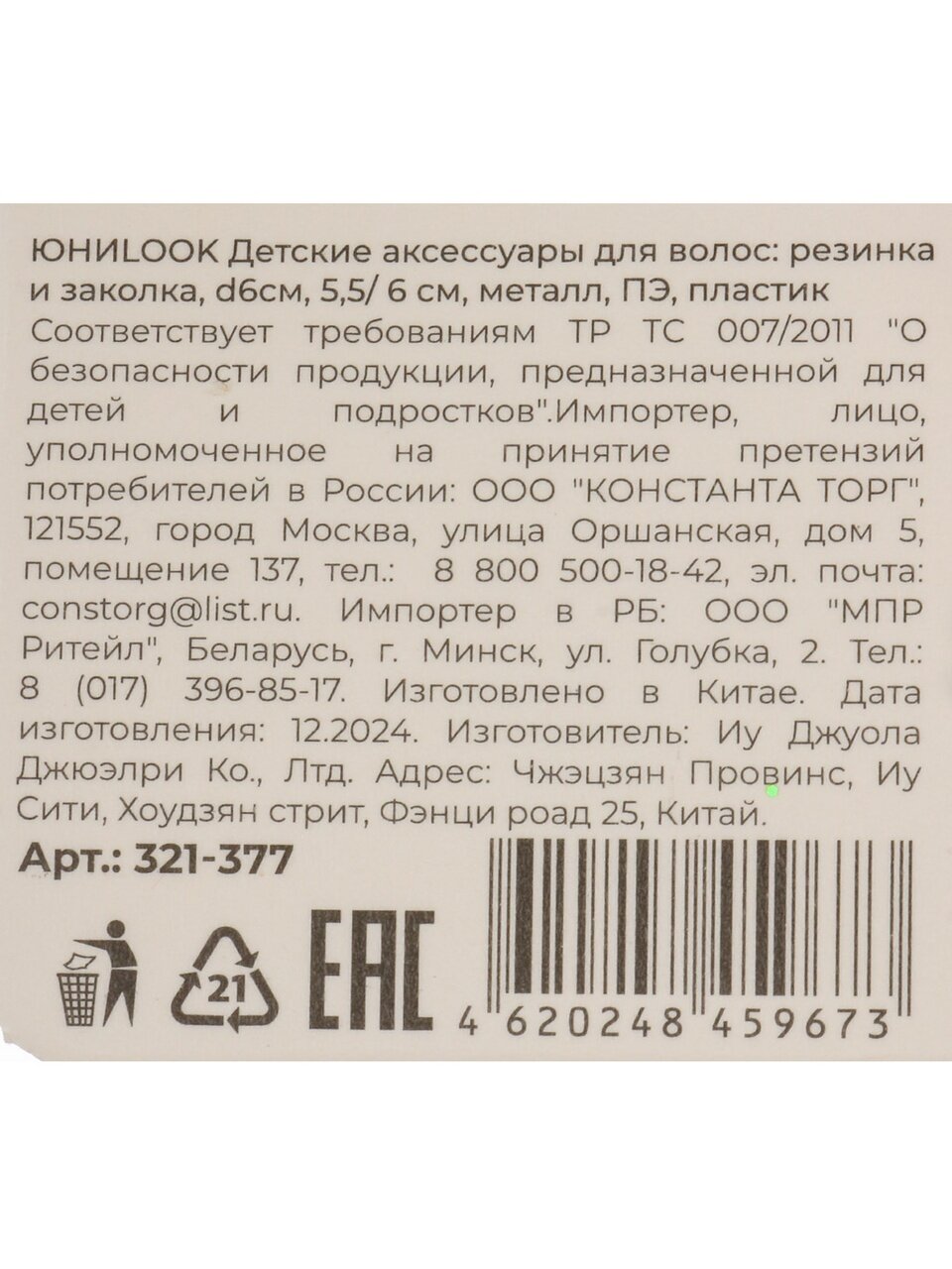 Вы можете приобрести «Набор для волос детский ЮниLook, металл, полиэстер, пластик, в ассортименте, резинка 6 см, заколка 5.5/6 см, 321-377» и другие товары в нашем интернет-магазине в Липецке по низким ценам и с бесплатным самовывозом.