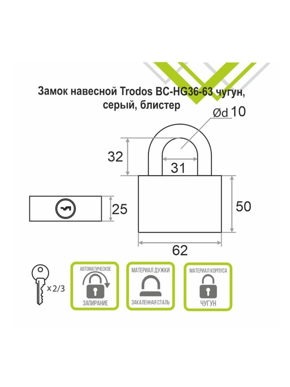 Вы можете приобрести «Замок навесной Trodos, BC-HG36-63, 210 047, блистер, цилиндровый, серый, 3 ключа» и другие товары в нашем интернет-магазине в Обнинске по низким ценам и с бесплатным самовывозом.