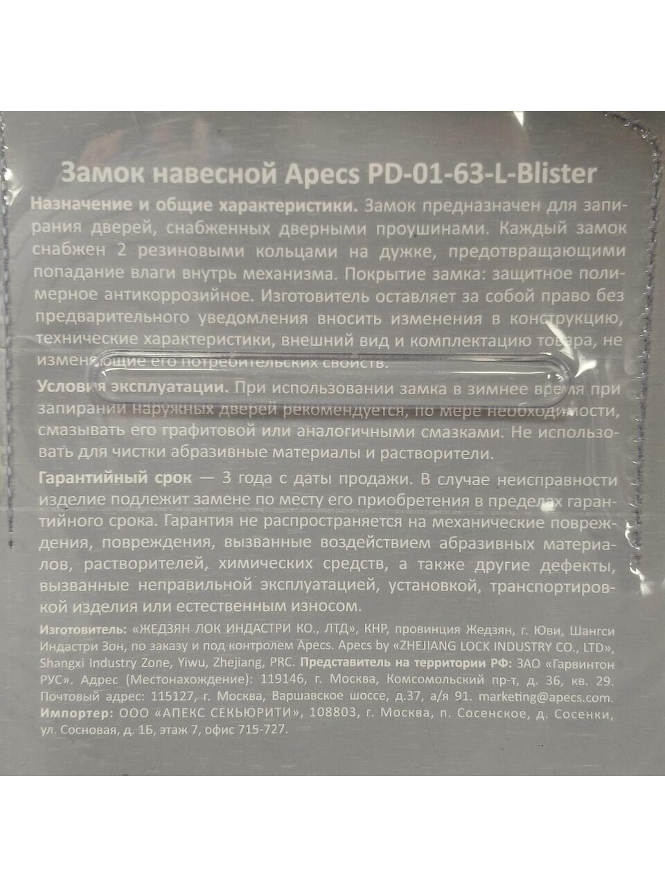 Вы можете приобрести «Замок навесной Apecs, PD-01-63-L, МВС-126-01, блистер, цилиндровый, с удлиненной дужкой, 3 ключа» и другие товары в нашем интернет-магазине в Воронеже по низким ценам и с бесплатным самовывозом.