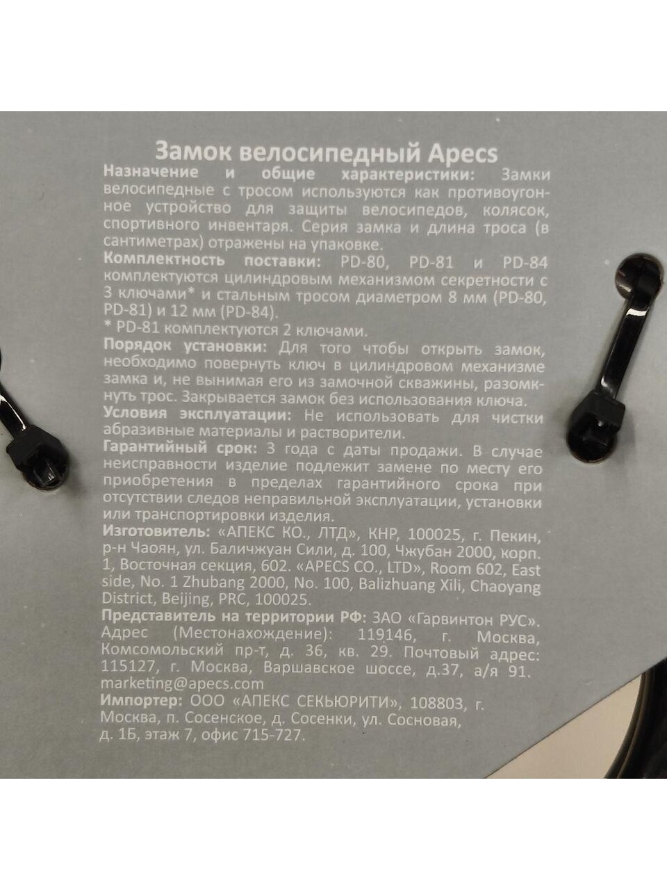Вы можете приобрести «Замок велосипедный тросовый, Apecs, PD-84-150, 1500 мм» и другие товары в нашем интернет-магазине в Курске по низким ценам и с бесплатным самовывозом.
