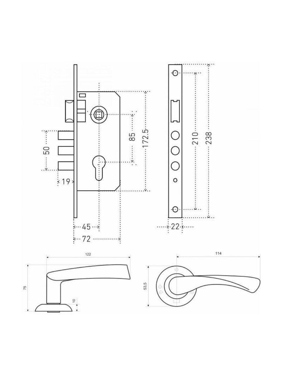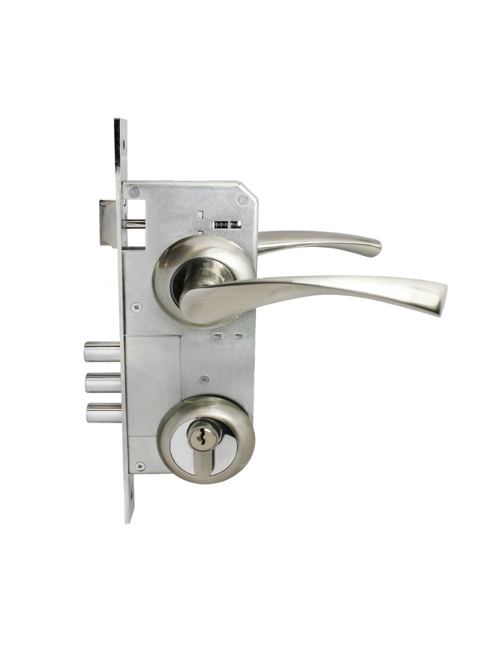 Замок врезной с ручками, цилиндровый. Предназначен для установки в деревянные двери толщиной 40-50 мм, правого и левого открывания. Стальной оцинкованный корпус, три цилиндрических ригеля. Межосевое расстояние - 85 мм. Удаление ключевого отверстия - 45 мм. Ручки раздельные - алюминиевый сплав, покрытие - гальваника. Комплектуется ответной планкой и стяжками, цилиндром с 5 ключами. Длина цилиндра - 60 мм.