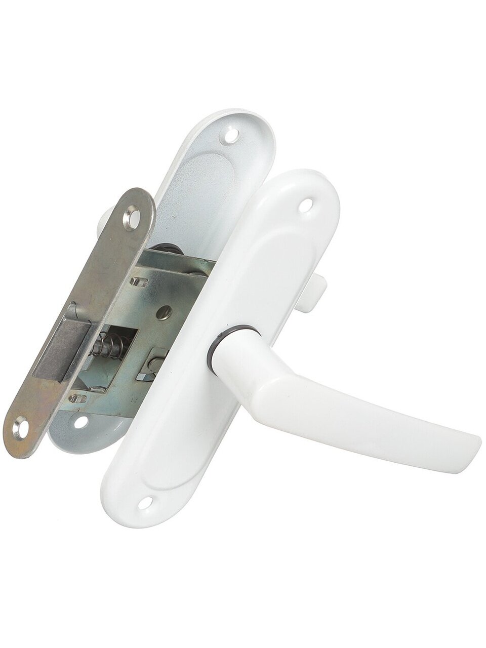 Комплектность: защелка врезная, планка запорная, шуруп (4х25), стержень, ручки фалевые.