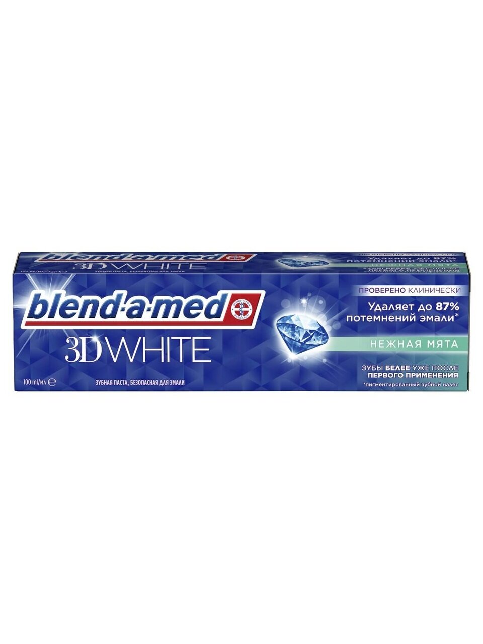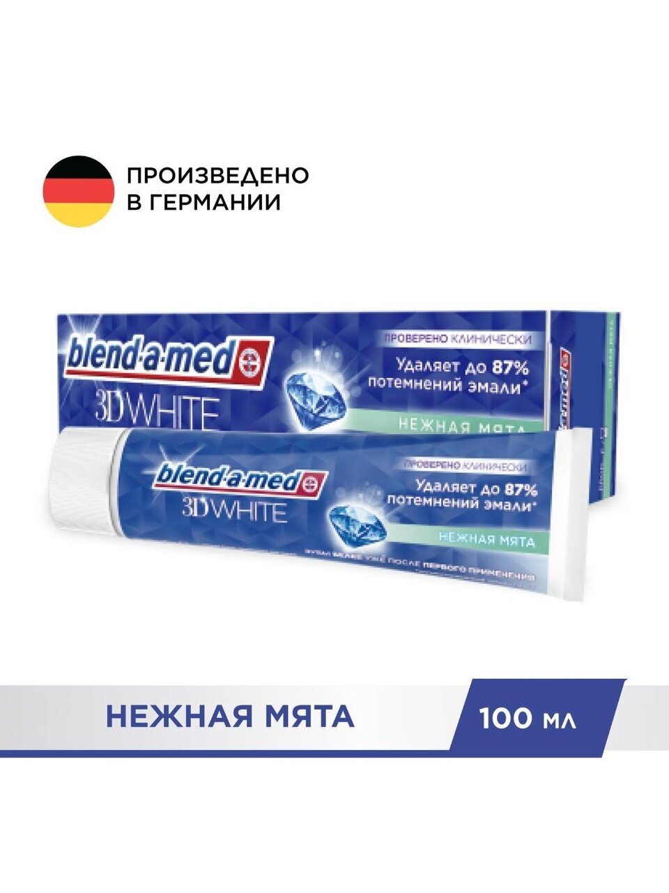 Безопасная для эмали отбеливающая зубная паста Blend-a-med 3D White Нежная мята делает зубы белее уже после первой чистки, удаляя до 87% потемнений эмали - пигментированного зубного налета. Проверено клинически. Паста со вкусом нежной мяты разработана со стоматологами и делает улыбку белоснежной. Подходит для ежедневного ухода.