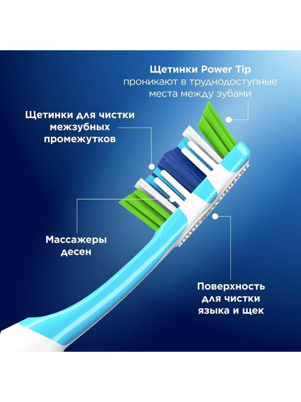 Щетинки для чистки межзубных промежутков вычищают налет между зубами. Центральная ромбовидная полирующая чашечка бережно удаляет потемнения поверхности зубной эмали. Щетка имеет массажеры десен, а также поверхность для чистки языка и щек. Щетинки Power Tip проникают в труднодоступные места между зубами и бережно очищают эмаль.